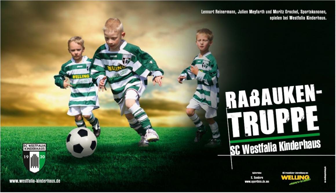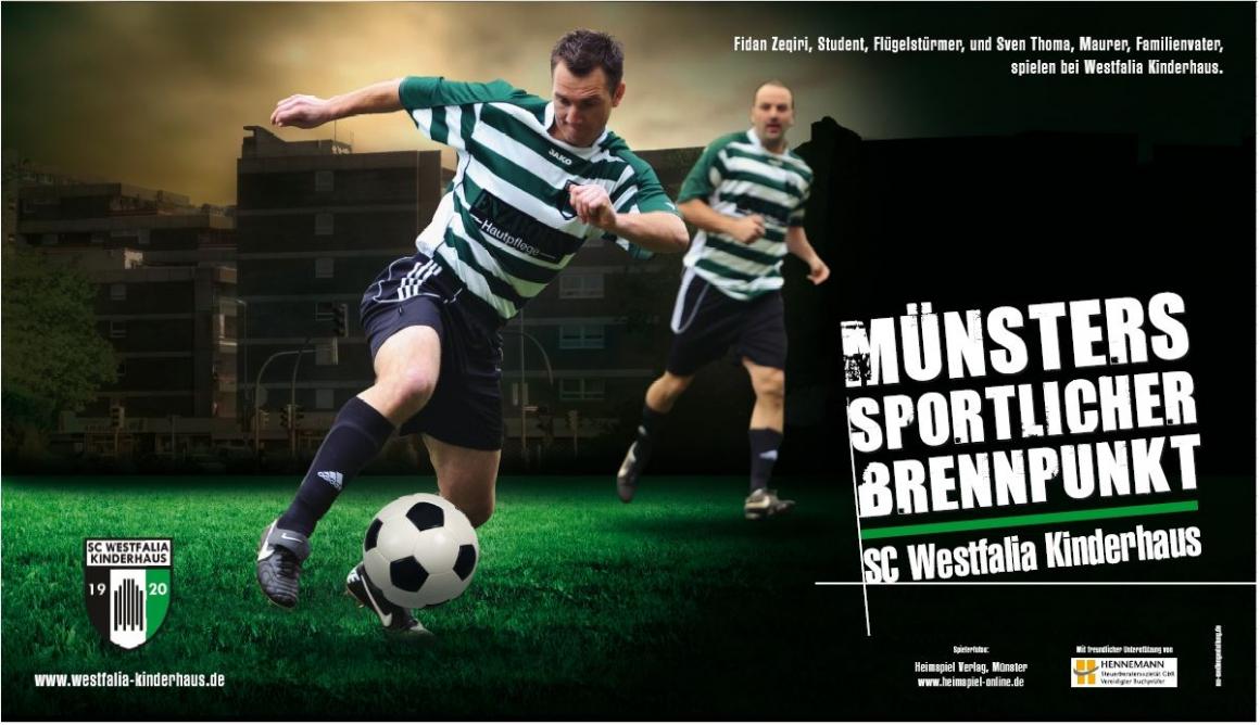 Diese Vorurteile werden durch die optische Nähe des Vereinsnamens "SC Westfalia Kinderhaus" getrennt lediglich durch den Balken in der Vereinsfarbe Grün auf den Verein übertragen, gleichzeitig jedoch durch die sympathischen Fotos und die kleine Personenbeschreibung oben rechts ad absurdum geführt.